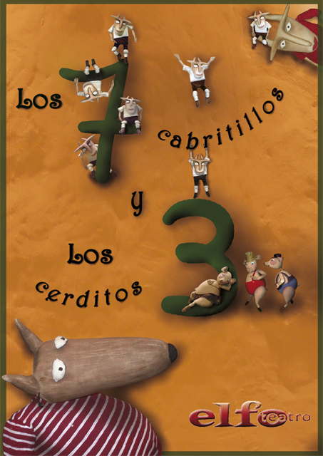 Los 7 cabritillos y los 3 cerditos. El reto de Elfo Teatro es intentar que los niños, cuando vuelvan a casa después de ver este espectáculo, piensen y sientan que esos son los verdaderos siete cabritillos y los tres cerditos. Para ello han construido unas hermosas marionetas basadas en dibujos de Elisa Yagüe (premio nacional de ilustración infantil). Los actores que las manipulan lo hacen a la vista de todos, interrelacionándose con ellas, además de acompañar su actuación con canciones.