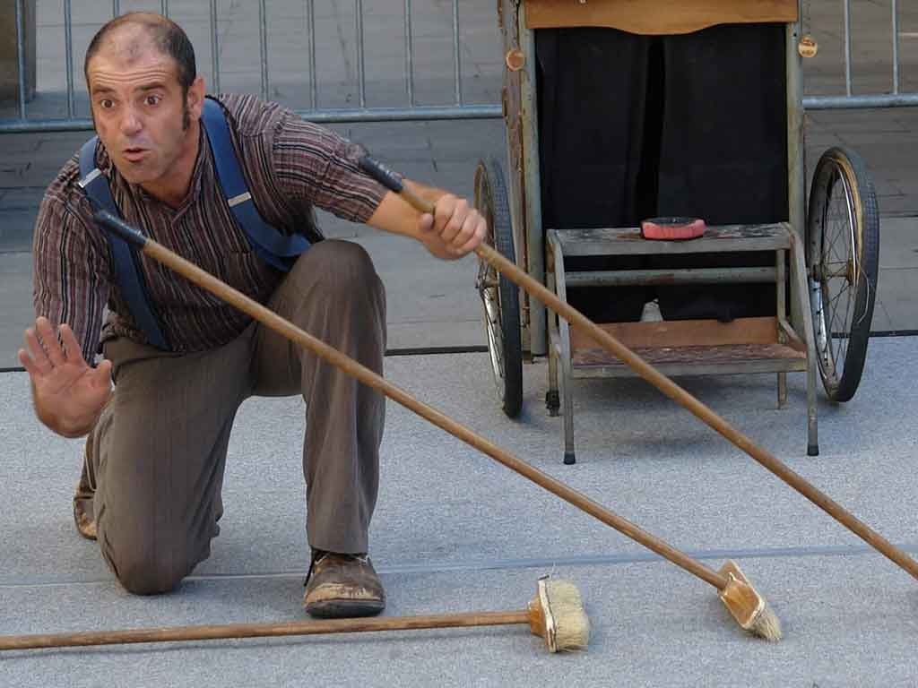 Un espectáculo basado en la jornada laboral de un barrendero, impregnado de humor y con el carisma del cine mudo. El protagonista se va encontrando diversas situaciones, provocadas por sus despistes y sus diferencias, para acabar convirtiendo su caos en bonitos números de circo llenos de fantásticas habilidades, manipulación de escobas, acrobacias, equilibrios. Todo ello tratado desde un entrañable payaso gestual que nos deleitará con su peculiar visión de la vida.