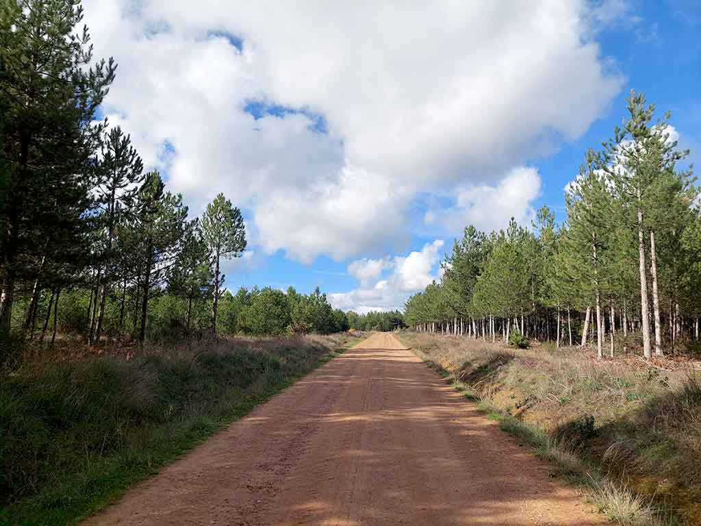 Para llegar hasta el embalse debemos tomar el camino que continúa dejando estas casetas a la derecha y seguirlo hasta llegar al embalse. No tiene pérdida. Por el camino discurriremos entre pinos y robles hasta llegar a la zona del lago artificial.